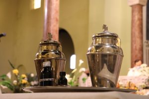 Se presentó el óleo puro del Olivo: para bendecir el Óleo de los Enfermos, materia para el Sacramento del Amor Compasivo del Señor, que sana nuestras dolencias y confeccionar el Santo Crisma, con el que los nuevos Bautizados y los Confirmandos serán consagrados y fortalecidos en su fe para configurarse en el triple ministerio de Cristo, Sacerdote Profeta y Rey; serán ungidas las manos de aquellos llamados al Sacramento del Orden Sacerdotal, y dedicados los altares en los que se ha de celebrar la Santa Eucaristía.