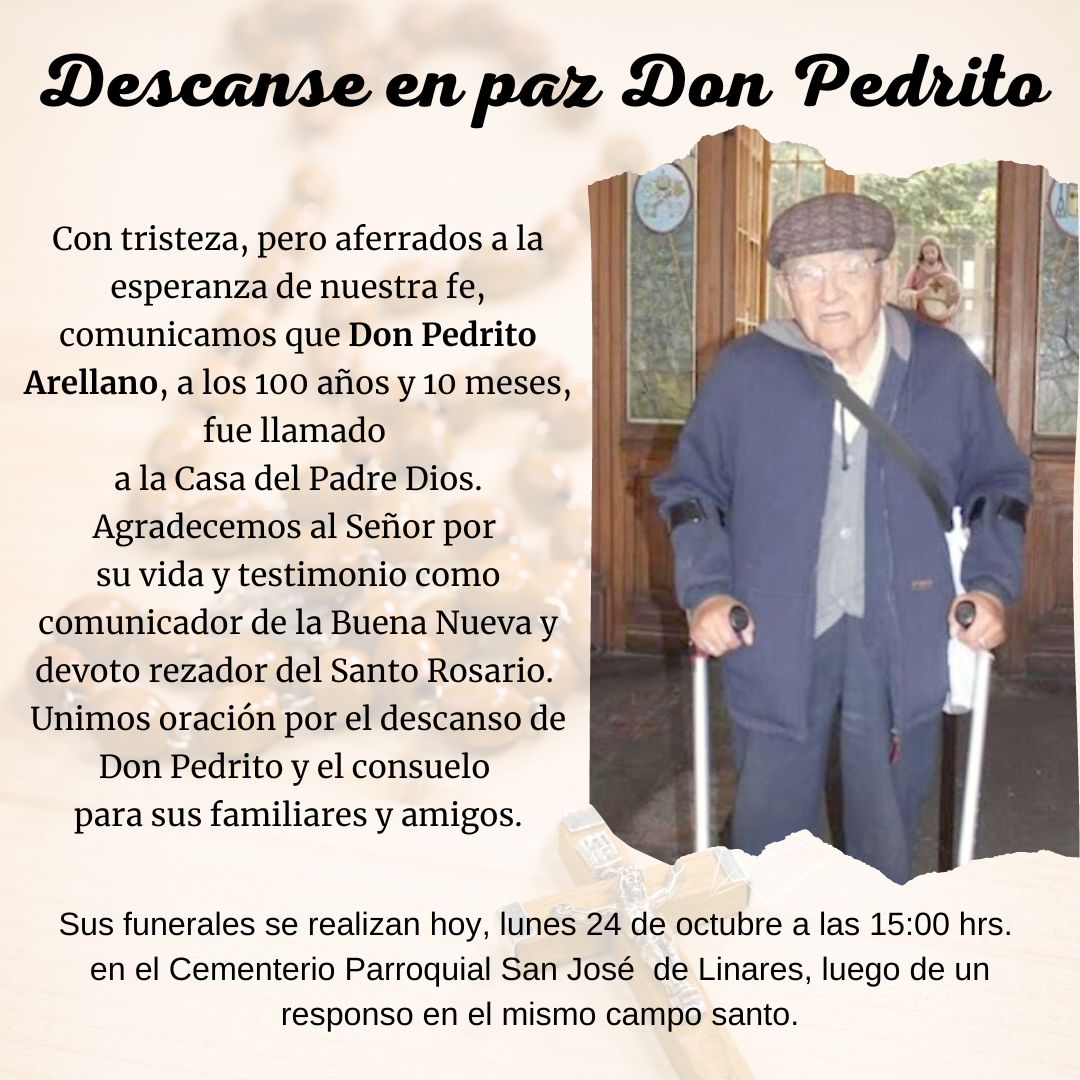 Con tristeza comunicamos el sensible fallecimiento de Don Pedrito Arellano, querido corresponsal del Periódico Diocesano Buena Nueva, que a los 100 años y 10 meses fue llamado a la casa del Padre.