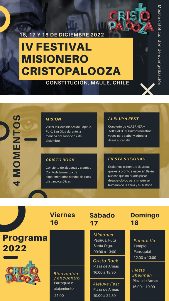 La ciudad de Constitución, al sur del Río Maule, en la Diócesis de Linares, se viste de fiesta y colorido, para invitar y recibir a los amantes de la música católica, expresados en el Festival Cristopalooza, que se realizará en su 4° vesrión, este fin de semana, los días sábado 17 y domingo 18 de diciembre, en el frontis de la Parroquia San José, destacando la participación de grandes y conocidos cantantes y agrupaciones católicas.