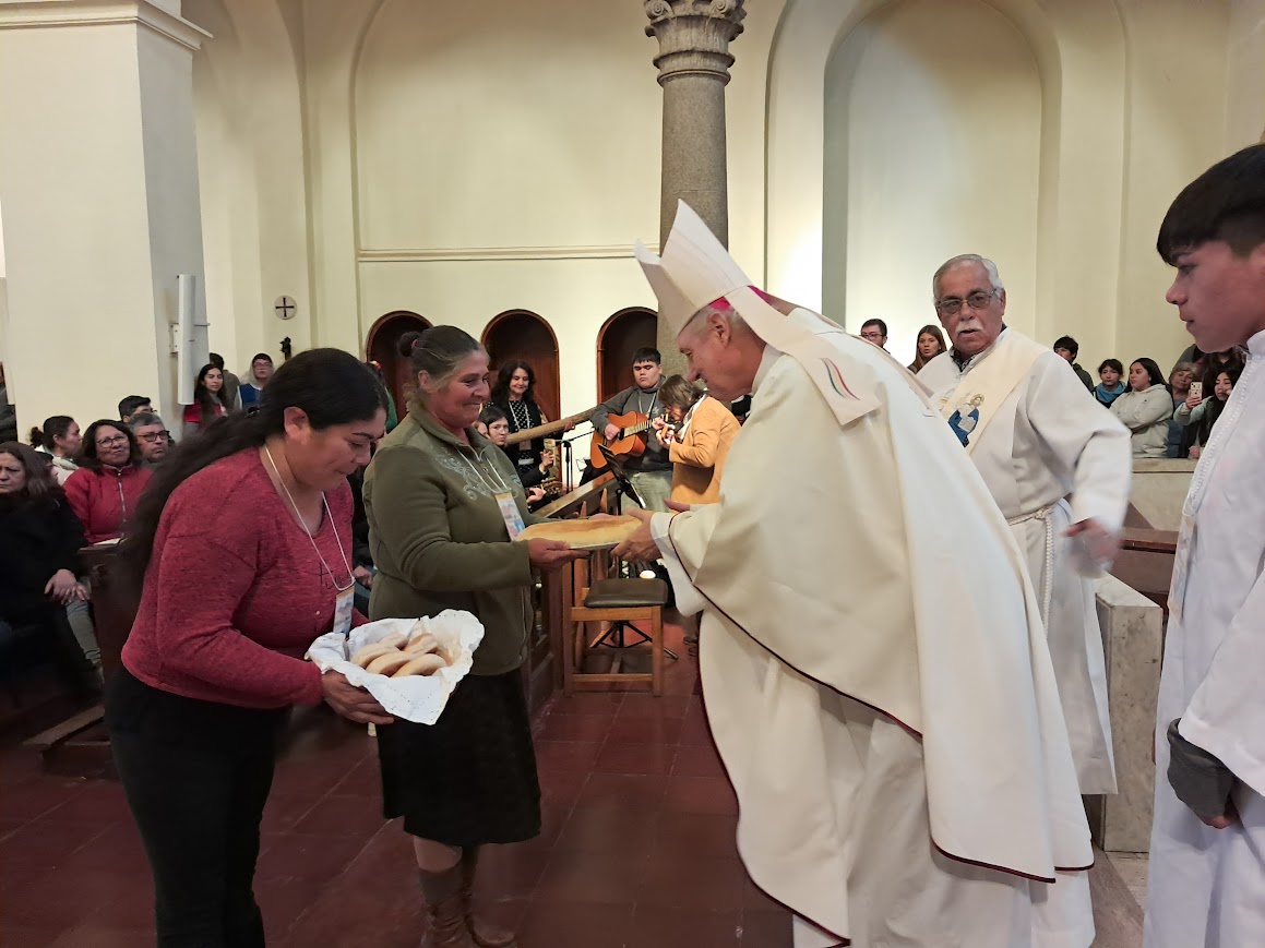 La Parroquia Nuestra Señora del Carmen de Nirivilo llevó una fuente de greda con pan amasado y tortillas de rescoldo, frutos del trabajo cotidiano que se comparte en familia.
