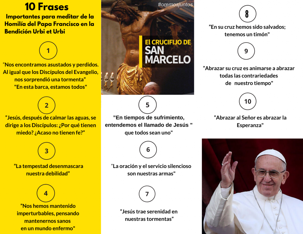 «¿Por qué tenéis miedo? ¿Aún no tenéis fe?». Queridos hermanos y hermanas: Desde este lugar, que narra la fe pétrea de Pedro, esta tarde me gustaría confiarlos a todos al Señor, a través de la intercesión de la Virgen, salud de su pueblo, estrella del mar tempestuoso. Desde esta columnata que abraza a Roma y al mundo, descienda sobre vosotros, como un abrazo consolador, la bendición de Dios.