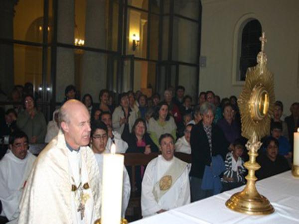 La celebración fue presidida por Monseñor Tomislav Koljatic, Obispo de Linares, concelebrada por el Clero local y una Iglesia Catedral colmada de fieles, tanto los (Adoradores) los inscritos para mantenerse en oración permanente, como los participantes del EDAP, que representaban a toda la diócesis.